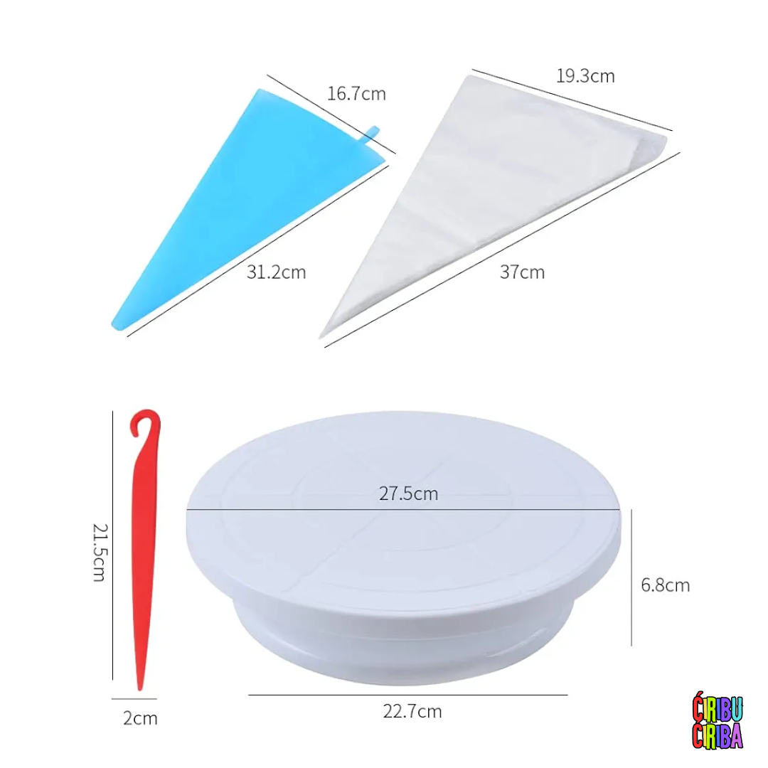 Set za dekoraciju torti i kolača sa rotirajućim postoljem pruža vam sve osnovne alate potrebne za pretvaranje vaših ideja u stvarnost.